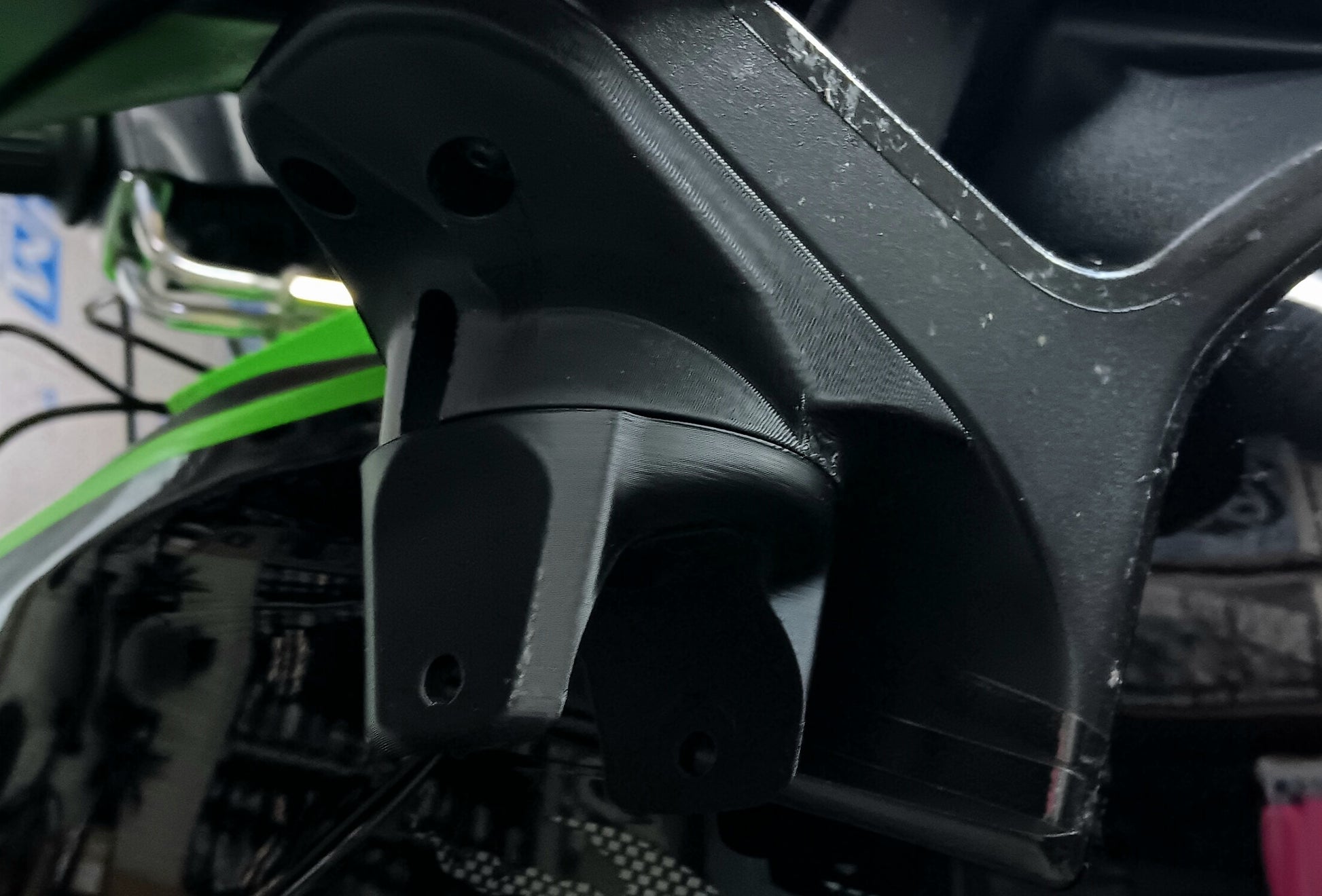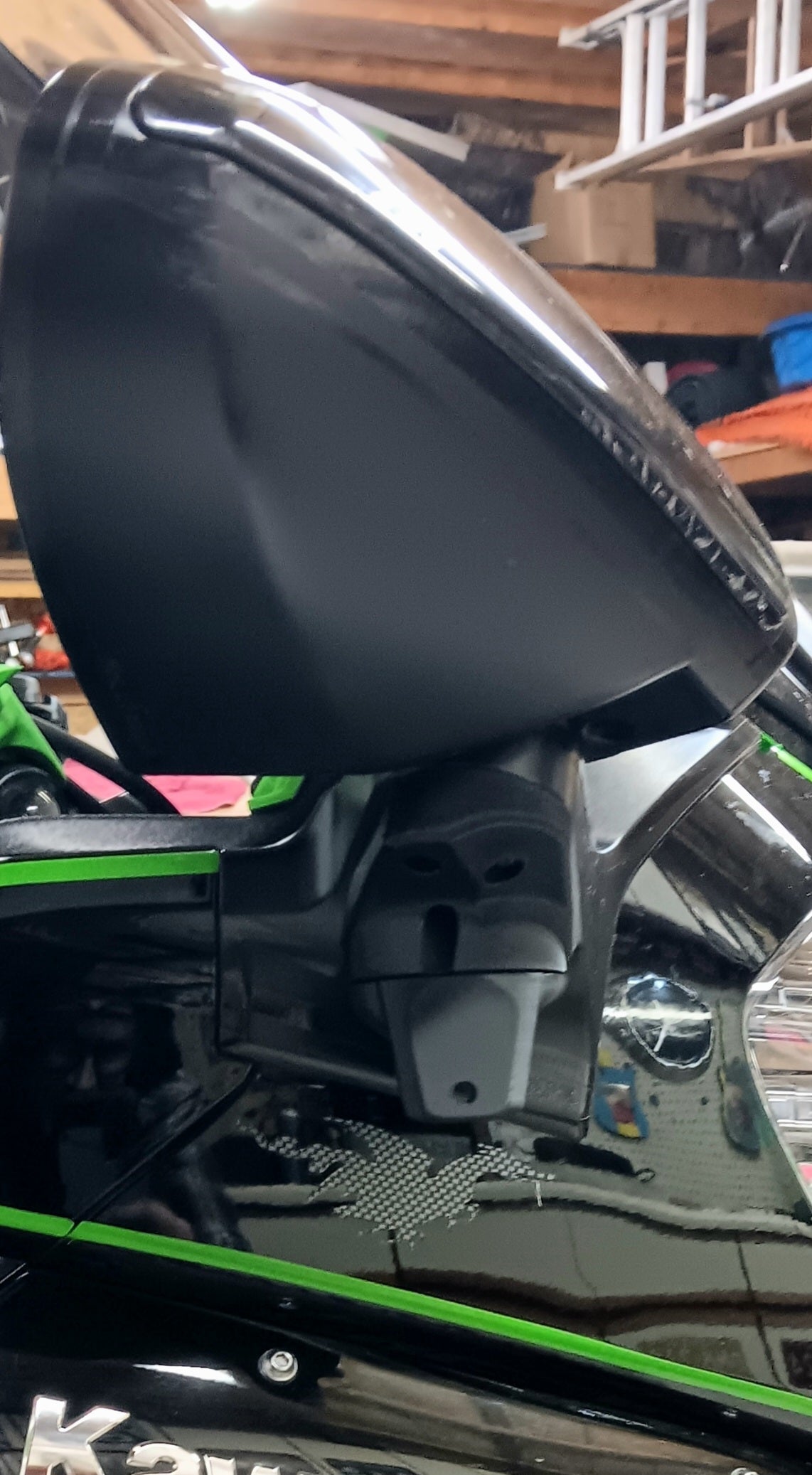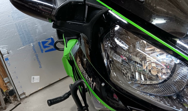 This single offset under mirror accessory mount provides a factory look to mounting accessories under your Kawasaki Concours 1400/GTR 1400 mirrors. The shape integrates with the mirror mount adding the mounting point seamlessly with a factory designed look. The center of the mounting plate provides a 45mm offset bringing the accessories much closer to the body preserving the sleek lines of the fairing. Some pictures show the available low profile 1" light pod which further provides a factory look for any light you wish to install.